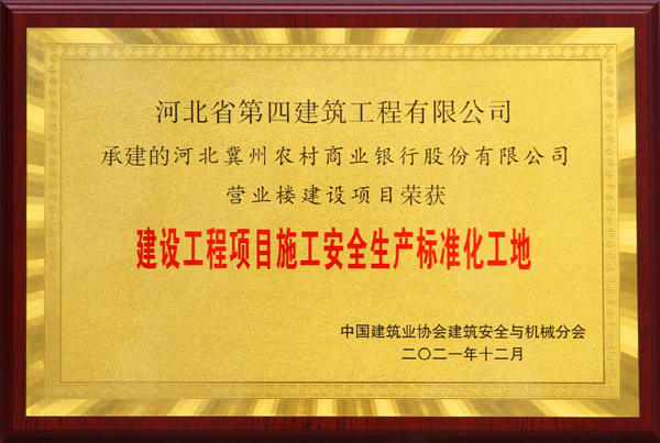 2021年12月22日,公司收到中国建筑业协会安全与机械分会下发的文件,我公司施工的河北冀州农村商业银行股份有限公司营业楼建设项目喜获全国安全生产标准化工地,这是公司第9次获得此项荣誉。